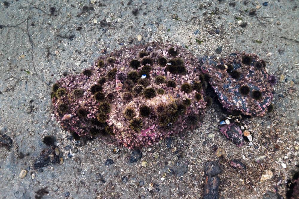 A crowd of green sea urchins sit on a boulder they have grazed bare of life. Only the empty shells of barnacles and hardy calcareous red seaweeds remain. © Aleksander Nordahl